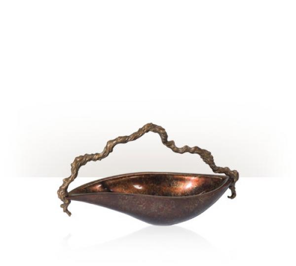 A leaf shaped lacquered coppered and gold bowl, with a cast aluminium and antiqued gold leaf driftwood handle.