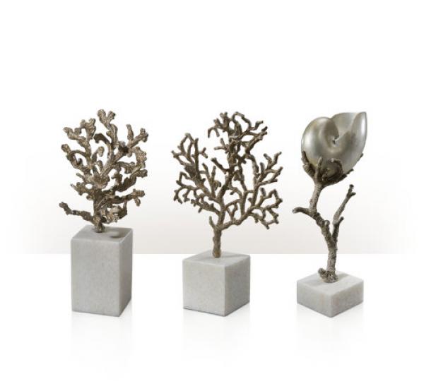 A set of three finely cast and gilt metal natural curiosity decorations, comprising one smaller and one larger cast Coral on a white marble base and a silvered metal Nautilus