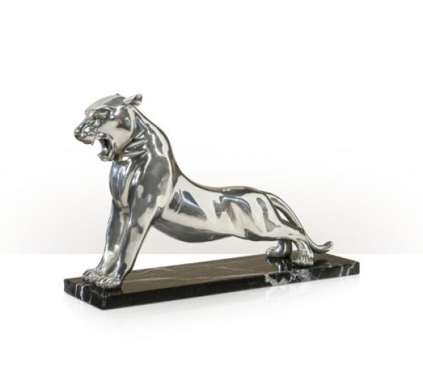 A stainless steel sculpture of a roaring panther on a veined black marble base. Inspired by an Art Deco original.