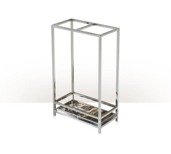 A stainless steel umbrella stand, with figured marble drip trays.