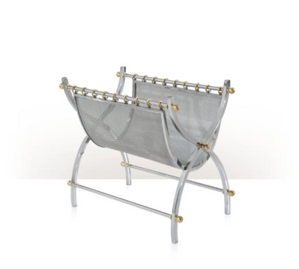 A stainless steel and brass accented magazine stand, the wavy X end supports joined by stretchers supporting a magazine hammock suspended from brass rings.