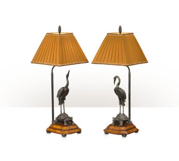 A pair of verdigris brass table lamps, each with a crane standing on a turtle, on burl plinth bases, with pleated silk shades. The originals Japanese Meiji period.