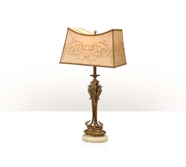 A patinated brass table lamp, the scroll and acanthus leaf mounted body on an oval onyx base surmounted by an hand sewn and embroidered silk shade. The original 19th c