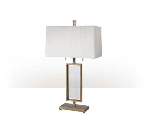 A brass framed and clear glass table lamp, the brass frame body enclosing a bevelled edge mirror plate, mounted on a rectangular raised platform base, surmoun