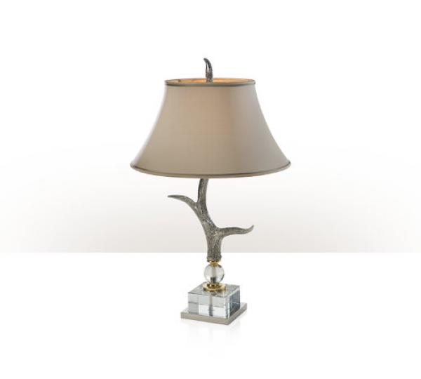 A stainless steel antler table lamp, mounted on a glass ball with brass accents and a glass plinth base, surmounted by a fabric shade.