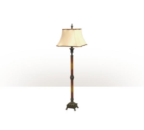 A verdigris brass and leather panelled floor lamp, the urn capital and square base with lion paw feet, surmounted by a hand sewn silk shade. The original Napoleon III.