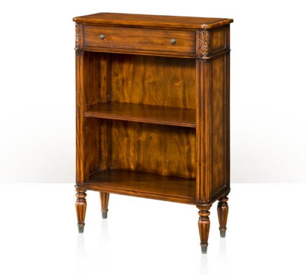 A low open bookcase, the rectangular top with rounded corners above a frieze drawer and adjustable shelved section below, the carved leaf capitals and fluted uprigh
