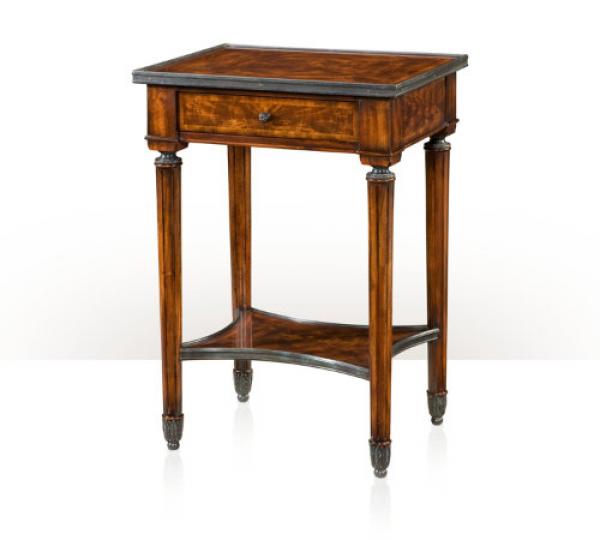 A mahogany lamp table, with verdigris brass fittings, one frieze drawer, on turned fluted legs and concave undertier. The original Regency.