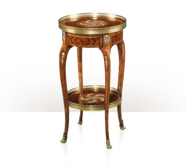 A cherry, rosewood and mother of pearl inlaid lamp table, the circular brass galleried marquetry top and undertier of scrolling leaves above a rosewood inlaid frieze, on cariole