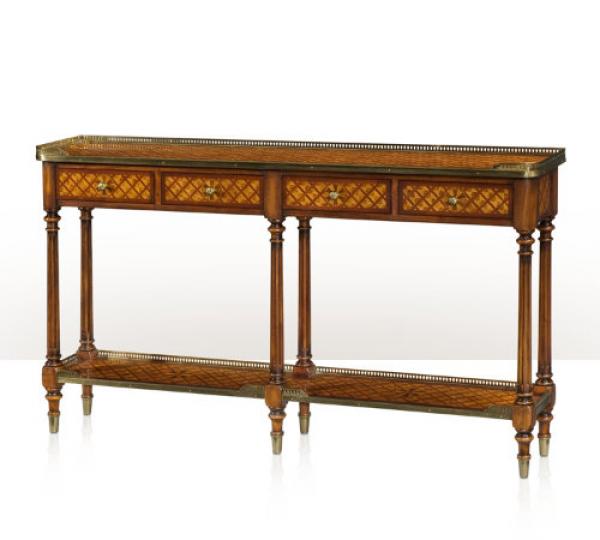 A burl lattice parquetry, brass mounted console table, four frieze drawers, on turned and fluted legs joined by an undertier. The original Louis XVI.