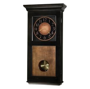 his wall clock is finished in Worn Black with brown accents and features Vintage Umber finished lower door panel, dial and back panel.