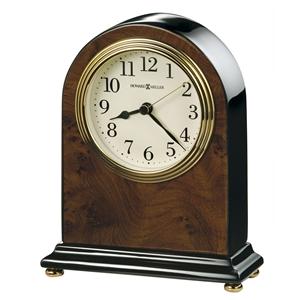 An attractive high-gloss walnut piano finish on a hardwood arch table clock featuring a wood burl pattern on the front and back, with black sides and base. Polished brass button feet.