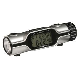 This clever world time travel alarm clock doubles as a LED flashlight, and is finished in metallic silver with black trim.