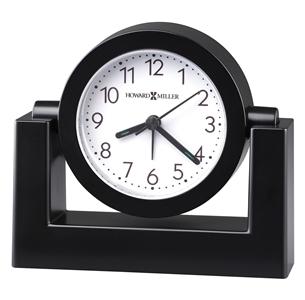 This Black Satin finished tabletop alarm clock features a round clock case supported in a rectangular base.