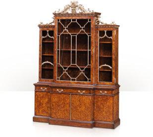 A figured mahogany and finely gilt library bookcase in the Chinoiserie taste, the finely acanthus and floral basket carved pierced and gilt cornice above unusual a