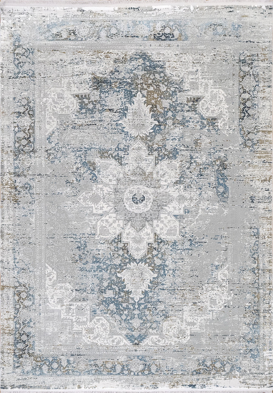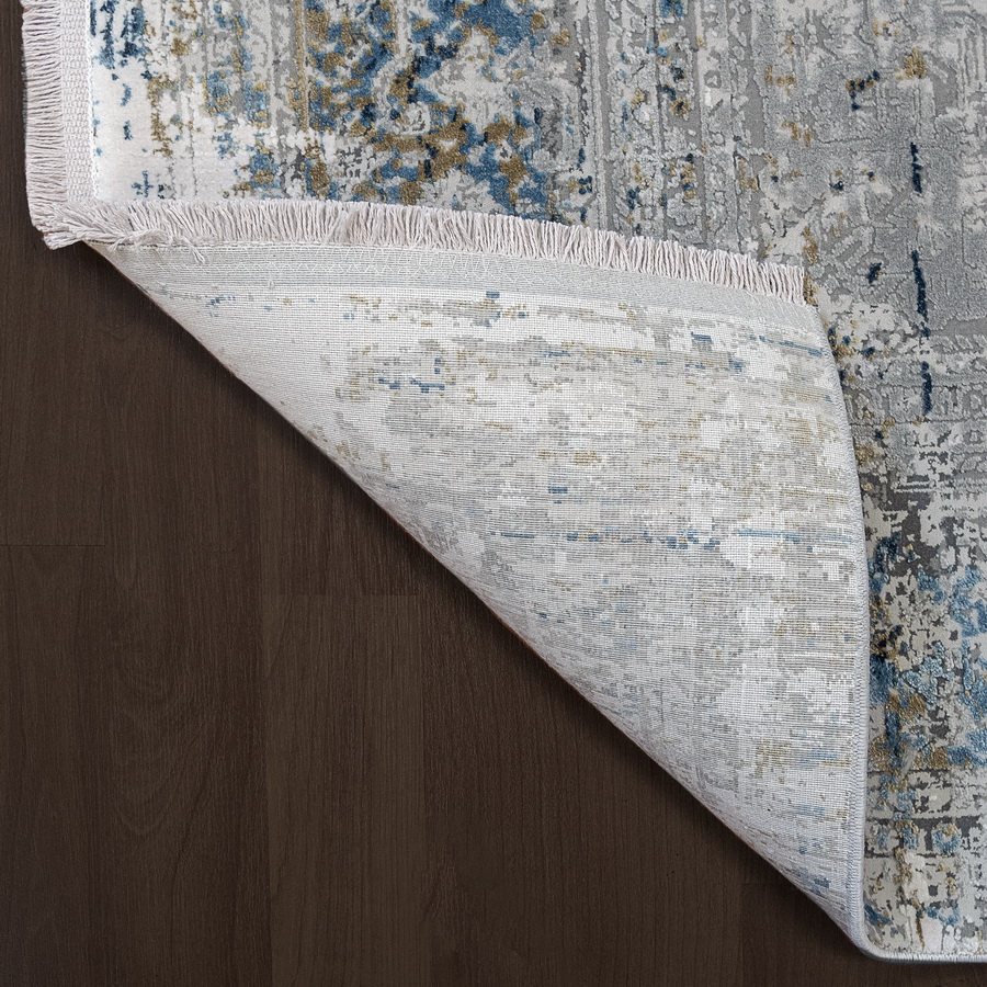 Ruby is 70% viscose, 30% acrylic, machine-made in Turkey. The construction and the intricacy of the design work give these rugs a true valuable handmade look with stunning traditional, abstract, and modern designs. The 2 million construction point creates a high-end look with soft hues of grey with pops of captivating blues and folds in its mosaic like texture.