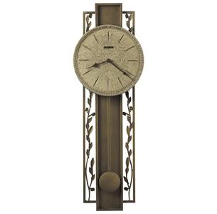 Wrought iron pendulum wall clock features vine and leaf ornamentation along the sides.
